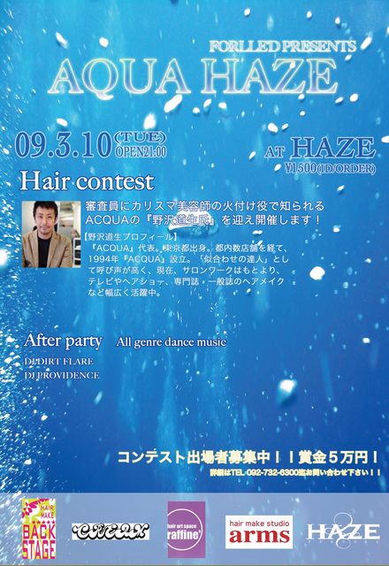 本日、平日ですがHAZEではイベントです!! 化粧品会社FORLLE/D PRESENTS 「AQUAHAZE」 があります! カリスマ美容師ブームの火付け役となった 『野沢道生』氏を審査員に迎え ヘアーコンテストを開催します! [野沢道生 プロフィール] 1994年に綾小路氏・青山氏とともにACQUAを設立。一人ひとりの個性を生かし、 どんなスタイルも思いのままに表現できる『似合わせ』の達人として、最先端の流行スタイルを 次々と生み出す。現在、サロンワークを中心にTV、ヘアョー、雑誌などの各分野で活躍中。 美容師の方で知らない人が