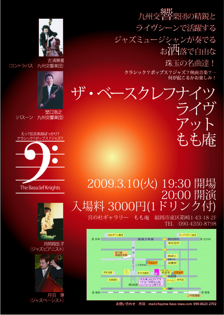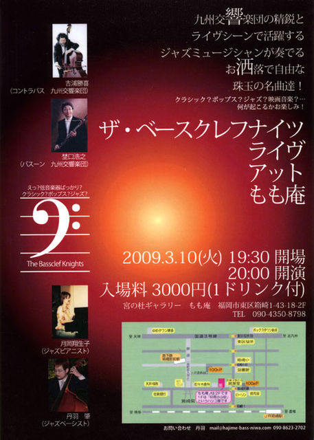 【開場】 19:30/20:00〜 【出演】 吉浦勝喜(コントラバス):九州交響楽団所属 埜口浩之(バスーン):九州交響楽団所属 月岡翔生子(ピアノ):ジャズピアニスト http://shoko-pf.com/ http://shoko-pf.jugem.jp/ 丹羽肇(ベース):ジャズベーシスト http://hajime-bass-niwa.com/ http://blogs.yahoo.co.jp/hjbass2000 【料金】 \3,000(ワンドリンク付) 【会場】 もも庵 〒812-0053 福岡市東区箱崎1-43-18-2F 090-4350-8798 http://www3.coara.or.jp/~momoan/index.h