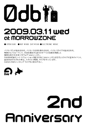管理人様イベントの告知失礼します。 適切でない場合はご面倒ですが削除してください。 ■0db 2nd Anniversary at morrowzone 2009/3/11 wed open 10:00 w/f ¥1000 day \1500 >>GUEST LIVE Tomohiro Nakamura - 7th gate >>LIVE YooNakamura. ShionG4. Junkan. ANOS .Hazy. Sloth. >>DJ Hisashi. Suguru morrowzone http://morrowzone.com/morrowzone/top/ 0db website http://www.0decibel.com/ info info@0decibel.com