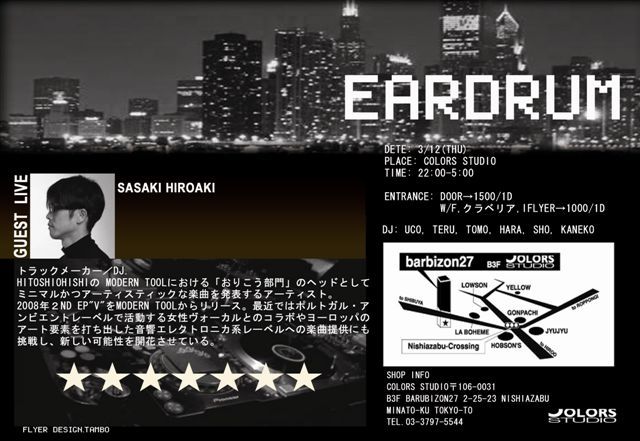 始まりから週末に劣らない盛り上がりを見せている平日泥酔パーティーは今回、EARDRUMをメインフロアに迎えて開催される。