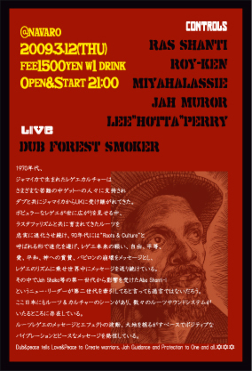 管理人様スペースお借りします。 早めの告知になりますが熊本発ルーツイベント始めます。 3月12日(木曜)@NAVARO †DUB&Peace† -music- Roots Reggae New Roots DUB Steppers -Controls- Ras Shanti ROY-KEN JAH MUROR MIYAHALASSIE Lee"HOTTA"Perry -LIVE- DUB FOREST SMOKER ~episode~ 1970年代、ジャマイカで生まれたレゲエカルチャーはゲットーの人々に支持されダブと共にジャマイカからUKに受け継がれてきた。 ポピュラーなレゲエが世に広がりを見せる中、ラスタファリズムと共に育ま