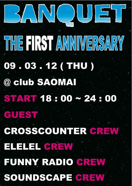 毎月第二木曜なんばのCLUB SAOMAIで行われるパーティBanquet!! NEW STYLEなROCK meets XXXXなPARTY “ Banquet ” 現在はホームであるBanquet以外に 第三木曜にBanquet DJ'sとしてELELEL@NOON 第四週週末にはVJとしてCROSS COUNTER@ROCKETSにも 出演しています。 ■BANQUET■ ▲THE FIRST ANNIVERSARY▲ 09.03,12 (THU) @club SAOMAI \1500w1d/FLYER\1000w1d START 18:00〜24:00 \1500/w1d DJ Cabot YoNekura TSAI GUEST CROSSCOUNTER CREW ELELEL CREW FUNNY RADIO CREW SoundScape CREW (ア