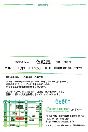 管理人様、お世話になります。 お知らせさせてくださいませ♪ ----------------------------------------------- 第2回 色絵 展 【 heal heart 】 開催 ◆大空あつこ 描き下ろし 【すべて新作です】 今回のコンセプトは、「ハートを癒す」です♪ ・新作にメッセージを載せた、CDサイズの小冊子を販売。 ・来場記念に、以前の作品のポストカードをプレゼント。 日時:2009年3月12日(木)〜17日(火)12:00〜19:30 最終日17:00まで 場所: ART HOUSE(2F ギ