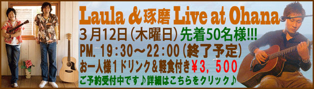 皆様、ALOOOOOOOOOOOOOHA♪ ウクレレショップOhanaアンディ(琢磨プロモーター)です♪♪♪ この度、湘南出身のメジャー・アーティスト!!!「LauLa」さんと一緒に 琢磨がライブを開催する事が決定致しましたぁ♪♪♪ 場所はOhanaの横、バグースさんで開催致します♪♪♪ 詳細は下記をご覧下さい♪♪♪ 皆様、是非是非、ご参加下さいませ〜〜〜〜〜〜♪♪♪ ALOOOOOOOOOOOOOOOOOOOOOHA!!! ----------------------------------------------------------- 2009年3月12日(木曜日) 湘南出身のメジャー・アーティスト、Laula(ラ