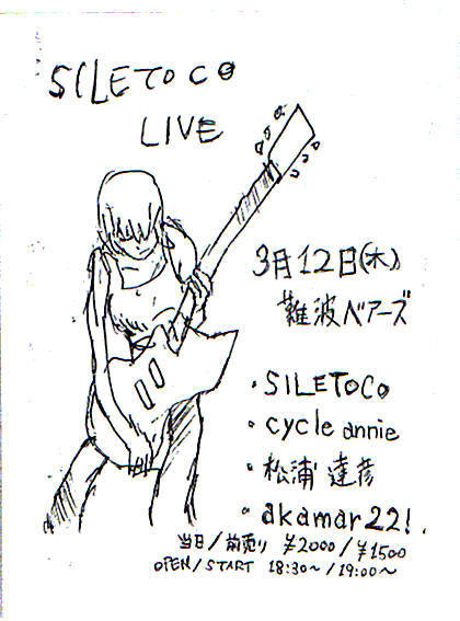 今週の木曜日、3月12日に難波BEARSにてSILETOCOのライブやります。 対バンは シューゲイザーでクラウトROCKでPOPな「cycle annie」 BEARS界隈で絶賛されてるストレート系ノイズ「松浦達彦」 一人バンドスタイルなエレアコ弾き語りの天然女子「akamar22!」 と、見事にジャンルバラバラ(笑) さすがBEARS、面子が濃いです☆ SILETOCOは多門くんを加えた5人編成でのライブとなります。 よりカオスなリズム隊となりました〜 SILETOCOの出番は最後の方になると思います。 対バンも面白いのでお暇な方は是非! open/start 18:30〜/1