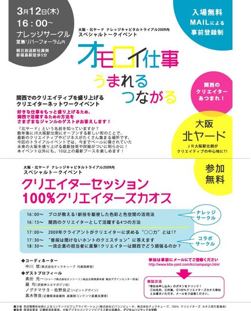 ■“北ヤード”(http://kita-yard.com/)をクリエイターの登竜門に!! 3月12日(木)16:00〜19:30は、 『100% クリエイターズ カオス』に行こう!! ▼うれしいポイント1 クリエイターの皆様は、 ぜひポートフォリオをお持ちください! 新しい出会いが広がるはずですよ! ▼うれしいポイント2 チュラキューブとビバコンピュータが出展している ブースに来られたクリエイターさん・学生さんには、 先着300名にオリジナル原色Tシャツをプレゼントします!無料です