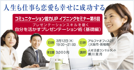 プレゼンテーションスキルを磨く 〜自分を活かす心理学プレゼンテーション術(基礎編)〜 ------------------------------------------------------------ 仕事・地域社会、さまざまなステージで活躍する人材には、 プレゼンテーション能力の所持が必須です。 自分の情報や考え、情熱を相手に伝えて 相手の行動や物事を推し進めるチカラは、 スピード、情報化・国際化社会においては欠かせないジャンルです。 説得力でもあり、問題解決力・・・ しいては人間関係力をもふくむ社会的なスキルとして プレゼンテーションを自分のもの