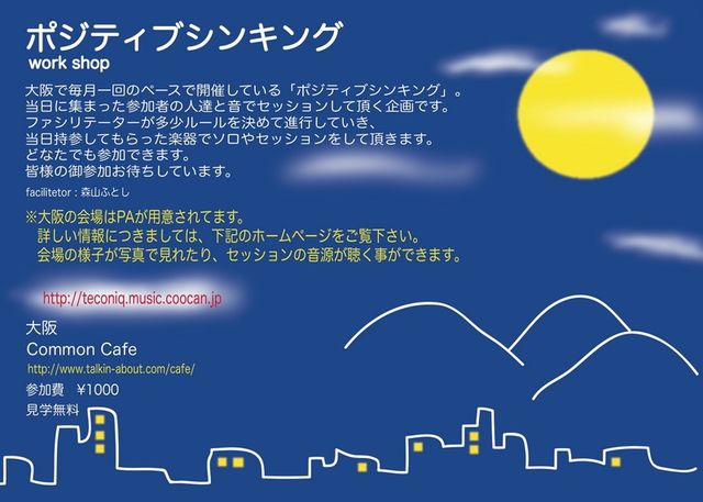 コモンカフェにて毎月1回のペースで行われている 音のワークショップ「ポジティブシンキング」 当日参加者の方々の持参して頂いた楽器で ファシリテーターが少しだけルールを決めて進行していき ソロやセッションをして頂きます どなたでも参加して頂けます 皆様の御参加お待ちしています ■facilitator:森山ふとし 05年よりバンド「かきつばた」にギターで加入。その他に電子音トリオ「マイクロフトシ」や、空き瓶を使って演奏する「アキビンオオケストラ」、フォークユニット「ゆくとしくるとし」、セッション共演で、稲田誠、内