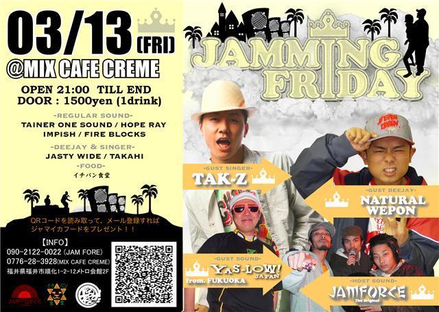 管理人様イベント告知失礼致します。 JAM FORCE PRESENTS "JAMMING FRIDAY 〜2周年SPECIALの巻〜" 開催日 :2009年03月13日(金曜日) 開催場所:福井片町@MIX CAFE CREME 開催時間:夜9時〜翌朝2時頃まで 料 金:チケットはありません。 当日1500円 with 1Drink "GUEST ARTIST" *NATURAL WEAPON *TAK-Z "GUEST SOUND" *YAS-LOW JAPAN "SOUND" *JAM FORCE *FIRE BLOCKS *TAINER ONE DA IRIE VIBES SOUND *HOPE RAY *IMPISH "LIVE" *TAKAHI *JUSTY WIDE "FOOD"