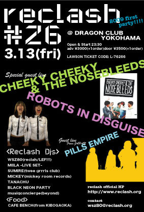 横浜発 00's ROCK & ALL MIX ALL NITE PARTY「reclash」の 2009年第一発目が遂に開催決定!!! なんとGUESTには、翌日のBRITISH ANTHEMSにも出演する、 CHEEKY CHEEKY & THE NOSEBLEEDSとROBOTS IN DISGUISEの二組を、 UKより迎えてお贈り!!! さらに、BAに新設されたステージへの出演も決まったPILLS EMPIREが、 reclash初登場と共に、日本を代表してゲスト陣とあいまみえる、 一発目に相応しい、ド派手なオールナイター♪ reclash DJ'sはもちろん、さらなるゲストDJの出演も予定してるだけに、 お見逃しなく!!! 2009/3/13(fri) 「reclash