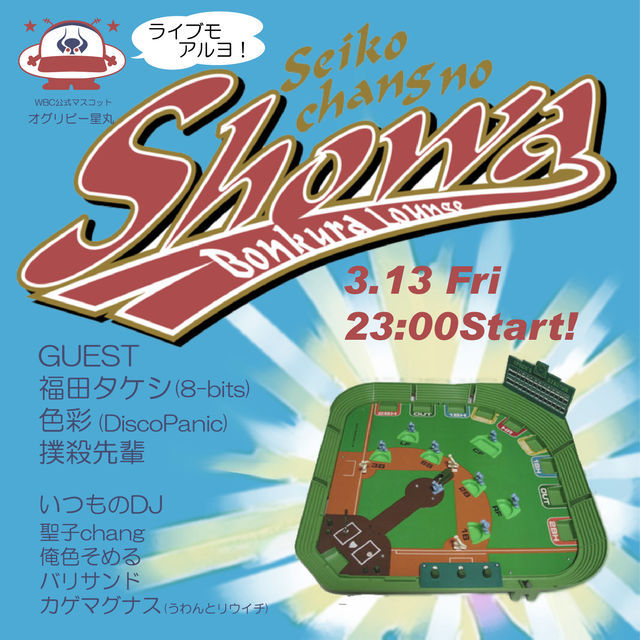 3/13(金)聖子changの昭和ボンクララウンジ@自由が丘ACID PANDA CAFE 【ALL ABOUT 昭和サウンド】 23:00START CHARGE:1000YEN @自由が丘ACID PANDA CAFE http://www.acidpanda.com/cafe/ 13日の金曜日! 東京No.1昭和SOUNDパーティー!(よく告知で見る文章) ついについに2周年目に突入であります!敬礼! 性懲りも無く、今月もまた自由が丘一丁目一帯に昭和の風を吹かせます! お送りするはアシパン昭和ボンクラ四人衆とゲストDJs! …そして今回もあの有名っぽいフォークユニットのガチLIVEあり。来なきゃソンソン