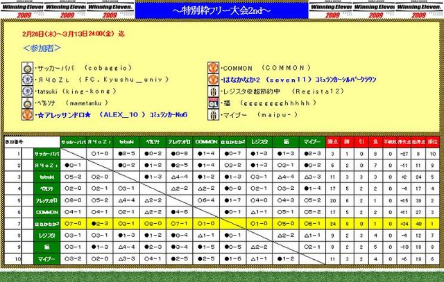 最初に!今回は今までの大会と形式や試合設定が異なりますので、 必ず大会進行方法を理解されてから参加表明お願いします。 参加の際、使用チーム、ウイイレ専用IDの記載がない場合、 参加と見なしません。 チームの変更も認めません。変更する場合は、一旦キャンセルし、再度参加の扱いに なりますので、IDと使用チームを再度書き直してください。 また、第9回欧州CLとの重複参加はご遠慮願います。 アシコンは管理の為参加いたします。 重要事項は必ず読んで下さい 特別枠フリー大会第2弾[PS3版]を開催致します