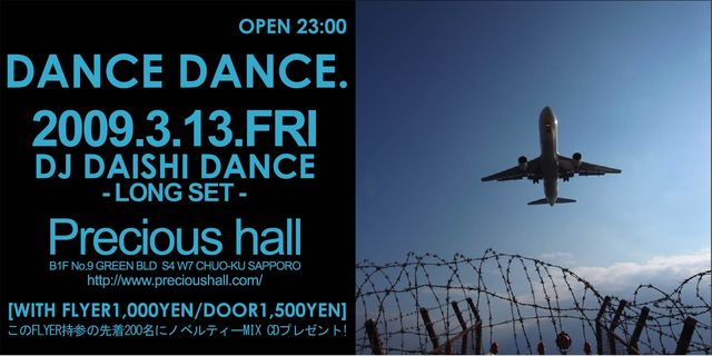毎月恒例Precious hallでLONG SET DJです! 2009.3.13.FRI 23:00 OPEN DANCE DANCE @Precious hall(札幌) http://www.precioushall.com/dancedance/index.html DJ DAISHI DANCE -LONG DJ SET!- FLYER 1000YEN / DOOR 1,500円 ここの画像プリントアウトか当日携帯画面で表示で1,000円で入場OKです。 ★先着200名様にノベルティーMIX CD(非売品)プレゼントです! 北海道の皆様、大集合よろしくお願いします!!!