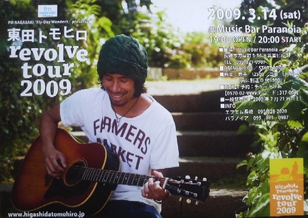 FM NAGASAKI 『Fly-day Wonder3』Presents 東田トモヒロ revolve tour 2009 2009.3.14(sat) @Music Bar Paranoia 19:00 OPEN/20:00 START ◆2009.3/14.(sat) 19:00 open/20:00 start ◆会場:Music Bar Paranoia(パラノイア) 長崎市万屋町3-36 多真喜ビル3F (095)821-0987 ◆OPEN 19:00/START 20:00 ◆料金:前売\2500 / 当日\3000(共に別途D代\500) ◆TICKET予約:チケットぴあ 【0570-02-9999/Pコード: 317-004】 ◆INFO エフエム長崎 095-828-2020 パラノイア 095-821-0987 東田トモヒロ "revolve tour 2009