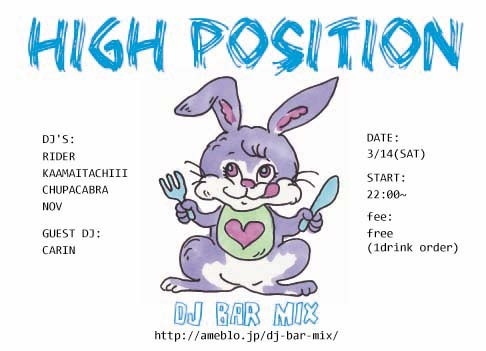 今週土曜日3/14はHIGH POSITIONですよー。 なんとこの日はホワイトデー 今回のゲストはテクノ界の巨匠「DJ CARIN」氏です。 それでは後日、乾杯しましょう 2009.03.14(sat) guest DJ : CARIN DJ : CHUPACABRA,kaamaitachiii,NOV,RIDER start:22:00- fee: free(1drink order) genre : techno,house ぜひ遊びにきてください。 from NOV