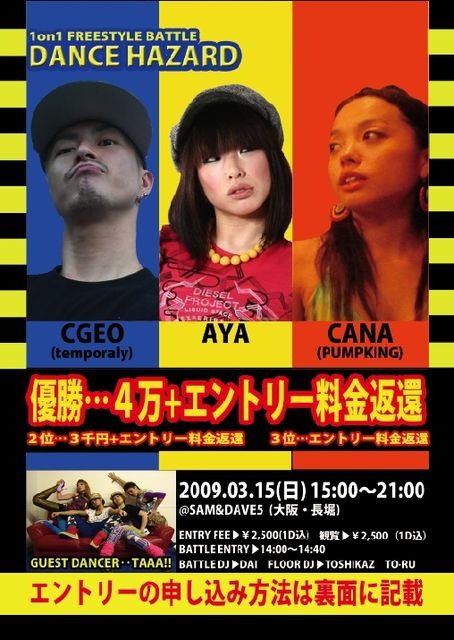 〜DANCE HAZARD 〜 <<1on1 FREE STYLE BATTLE>> 2009、3月15日(日) 15:00〜21:00 エントリー料金:¥2,500(1DRINK込) 観覧:¥2,500(1DRINK込) 優勝賞金:¥40,000+エントリー料金返還 準優勝:¥3,000+エントリー料金返還 3位:エントリー料金返還 ※優勝賞金4万円は3月迄の期間限定 場所:SAM&DAVE5(大阪・長堀) http://www.samanddave.jp/index.html ※堺筋線長堀橋駅の7番出口を出ますと斜め向かいにコンビニがあり、そのコンビニの横の並びに牛丼屋があります。その隣がSAM&DAVE5に