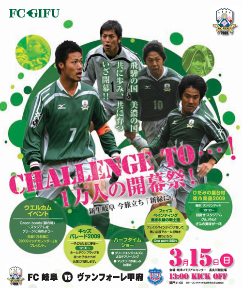 ☆開幕戦!3/15(日)vs甲府戦、Challenge to 1万人の開幕祭!! http://www.fc-gifu.com/news/315vschallenge-to-1.html 友達・家族を誘ってスタジアムへ! ●対戦相手情報 ・ヴァンフォーレ甲府公式HP http://www.ventforet.co.jp/ ・Jリーグ公式HP クラブガイド http://www.j-league.or.jp/club/kofu/ ●スタジアム情報 ・岐阜公式HP アクセス http://www.fc-gifu.com/news/2008/03/_41.php ・Jリーグ公式HP スタジアムガイド http://www.j-league.or.jp/stadium/nagaragawa/ ・施設情報(岐阜メモリアルセンター)
