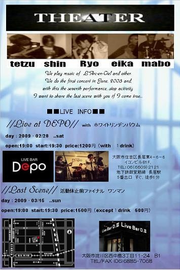 THEATER 7th Liveが決定! そして、活動休止前、最後のステージは LiVE Bar D3 に決定しました。 そして、ワンマンです! http://mixi.jp/view_community.pl?id=1523677 http://www.dcpro.jp/d3_top.html 音響、ステージ 共に、関西では他に無いシステムを揃えた最強の音のステージに、 結成から約一年、 今回で7回目のステージになる我々THEATER 5人が、 『最後のシーン』を 探しに行きます。 是非、見に来てください! ・・・・・・・・・・・・・・・・・・・・・ ■■■■■■■■■■ THEATER 7th