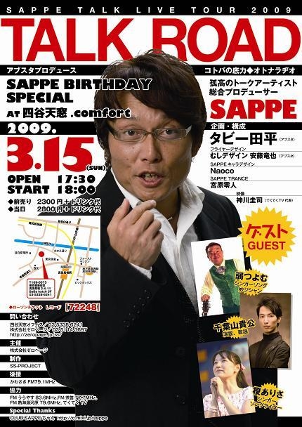皆さんに、「次はいつやるのか??」と言われながらすんません、公式に決定しました。 また更にパワーとストレス発散を発信します。 是非遊びに来て下さい。(SAPPEさんより) DAY 2009.3.15 OPEN 17:30/START 18:00 PRICE \2300(前売り) \2800(当日) (DRINK \500) ローソンチケットLコード : 72248 SAPPE TALK LIVE TOUR 2009「TALK ROAD」 アブスタプロデュース SAPPE BIRTHDAY SPECIAL 〜オトナラヂオ〜 「ちょっと小粋なトークと歌の夜」 ゲスト 弱つよむ http://mixi.jp/show_friend.pl?id=7419394 千葉山貴公 http://