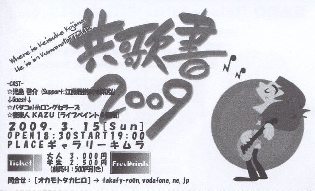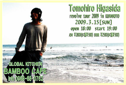 管理人様お邪魔します。 イベントの告知でございます。 2009.3.15[SUN]@熊本GLOBAL KITCHEN BAMBOO CAFE "東田トモヒロ revolve tour 2009 vol.9" □LIVE:東田トモヒロ(ソロアコースティック) □TICKET予約:0968-68-0762(BAMBOO CAFE) bamboo_cafe386@nexyzbb.ne.jp □INFO:0968-68-0762(BAMBOO CAFE) http://foodpia.geocities.jp/global_kitchen_bamboo_cafe/ □OPEN:18:00/START:19:00 □TICKET:ADV:¥2,000(D別\500)/DOOR:¥2,500(D別\500) □PLACE :熊本県荒尾市高浜386 "東田トモヒロ