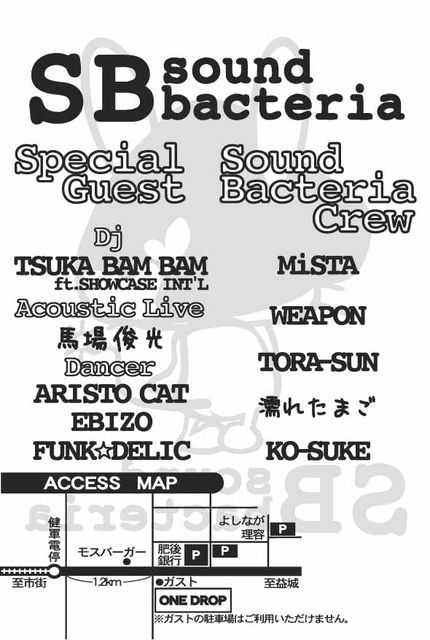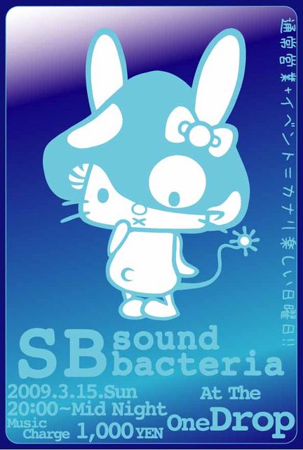 先日は久しぶりのINTER PLAYで俊美さんのLIVEを満喫! 翌日はDjangoにてこれまた久しぶりのロンドンナイトで大暴れでした♪ 東京からのゲストも豪華でまさに「男祭り」さながらでした。 ステージに引っ張り上げられたあげくシャツを脱がされ上半身裸で 踊りまくりでした。(年甲斐も無くちょっと恥ずかしい・・・・) 3月2ラウンドめのONE DROPイベントは 「SOUND BACTERIA」 いつもはパーティスタイルでやってましたが今回は ラウンジスタイルの通常営業で音楽山盛りっす! タイトル SOUND BACTERIA 3月15日(日曜