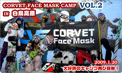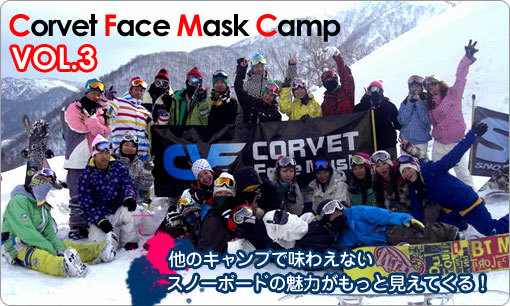 告知させてください。 CORVET FACE MASK presents 2008/2009 Camp VOL.4 < Concept > 従来の形にハマったLesson campとは、ちょっと違うCampはいかが 参加ユーザーがCamp内容を決めるCamp の第4弾!! コーチ陣が、参加ユーザーの声を聞き、滑りながら、欠点を突き詰めおさらいをする…そんなcampって今まで無かったかも。。。 無かったら作れば良いぢゃんって事で、作っちゃいました パークやジブ…パイプ…と遊び方は色々あるけど、基本はフリーランに有り。 まずは、参加ユーザーのフリーランを見せて貰ってから、個々の要