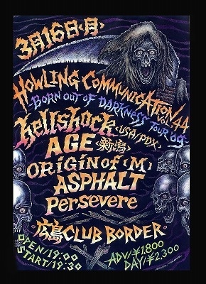 ■3月16日(月)@廣島CLUB ボーダー disk shop Misery presents -HOWLING COMMUNICATION vol.44- HELLSHOCK (PDX) AGE(新潟) ORIGIN OF [M] ASPHALT PERSEVERE OPEN 19:00/START 19:30 ADV 1800円/DAY 2,300円 2ヶ月ぶりとなるMISERYプレゼンツ企画「HOWLING COMMUNICATION vol.44」!! 今回のゲストはハードコアの聖地、ポートランドからの刺客、メタリック・ステンチHARDCOREバンド、HELLSHOCK!!と新潟のベテラン・メタリックCRUSTコア、AGE!! HELLSHOCK、AGEと共に久々となる2度目の来広!! 大好評だった前回を上回るステー