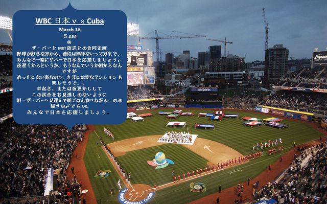 WBC 日本vsCuba March 16 5AM @ ザ・バーとMRT放送との合同企画 野球が好きな方から、普段は興味ないって方まで、みんなで一緒にザバーで日本を応援しましょう。 夜遅くからというか、もうなんていうか朝からなんですが めったにない事なので、たまには変なテンションも楽しそうで、、 早起き、または夜更かしして この試合をお見逃しのないように 朝一ザ・バーへ足運んで朝ごはん食べながら、のみ帰りの〆でもOK. みんなで日本を応援しましょう。 http://mixi.jp/view_community.pl?id=3139374