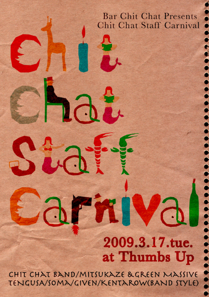 新百合ケ丘Bar Chit ChatのStaff祭り開催! Nao(YoleYole),Kan.cam(B:RIDGE style,光風&Green Massive),Kentarow, Gucchin(EX-B:RIDGE style),加藤昭彦(Given,EX-SCREAMING SOUL HILL), Naked,紫織,Ma-Ya,Naoの弟Shun,まーと(天草),渕上零(Mu=tenka!,宇宙軒,King Guild), 光風(Cool Wise Men,光風&Green Massive),イモっち(Soma), これみんなミュージシャンであり現旧Chit Chat Staffなのです!! 当日は可能な限り大集合してChit Chat BANDをやってみます! ちなみに店主の誕生日だそうです 3/17tue 「Chit Chat Staff Carnival!」 @横