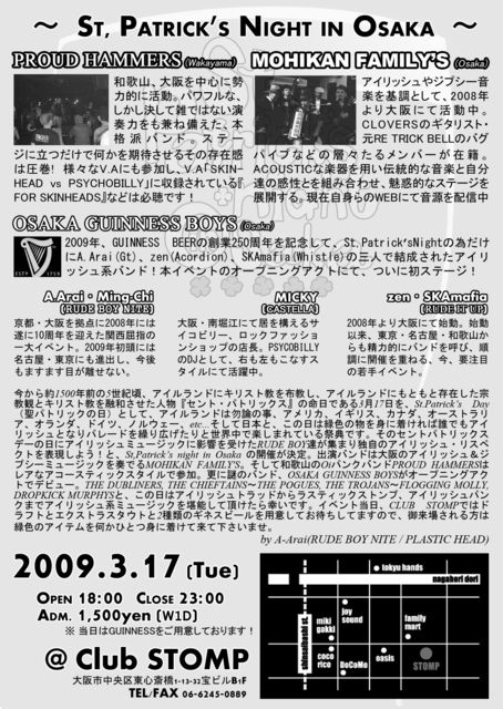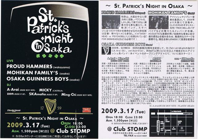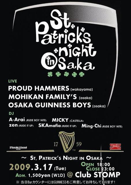 管理人様、告知失礼いたします。 アイルランドにキリスト教を布教した人物『セントパトリックス』の命日である3月17日『St.Patrick's Day』 この日は緑色の物を身に着ければ誰でもアイリッシュとなりパレードを繰り広げたりと、アイルランドは勿論の事、世界中で楽しまれている祭典です。 このSt.Patrick's Dayの日に、アイリッシュミュージックに影響されたRUDE BOY達が集まり独自のアイリッシュリスペクトを表現しよう!と、St Patricks Night in Osakaの開催が決定。 イベント当日、CLUB STOMPではドラフトとエクストラスタウトの2種類のギネ