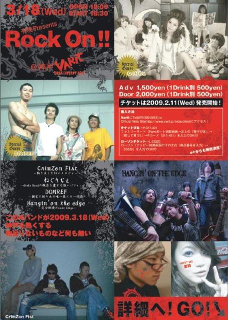 2009年3月18日(Wed) 「有暁Presents-Rock On!!-」@神戸三宮Varit CrimZon Fist -動き出した紅いメロディー- ねぐりぢぇ -Girls Bandの概念を覆す力強いパフォーマンス- DONREF -観客と創り出す唯一無二の一体感- Hangin' on the edge -完全燃焼のLast Stage- この4バンドが2009.3.18(Wed) 神戸を熱くする 物足りないものなど何も無い 18:00 open 18:30 start 22:30 close予定 前売り\1500(1D \500) 当日\2000(1D \500) HOST MC 蛮、愛羽 Special Guest DONREF ねぐりぢぇ Band Hangin'on the edge CrimZon F