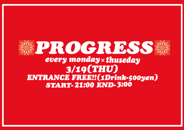 3月19日(木・祝前日)PROGRESS (HIP HOP,R&B,HOUSE etc...) @PREGO-night rush- 当日¥500 (1ドリンク込み) START 21:00 ◆DJ◆ SHIGEO,LEE,NAMBA,MARU,SILENT,YU-TA,BEN,SASUKE *この日でDJ NAMBAの和歌山でのプレイは一旦終了となります。 1ドリンク代¥500のみで入場していただけますので、ぜひ皆様PREGOにお越し下さい。 よろしくお願い致します。