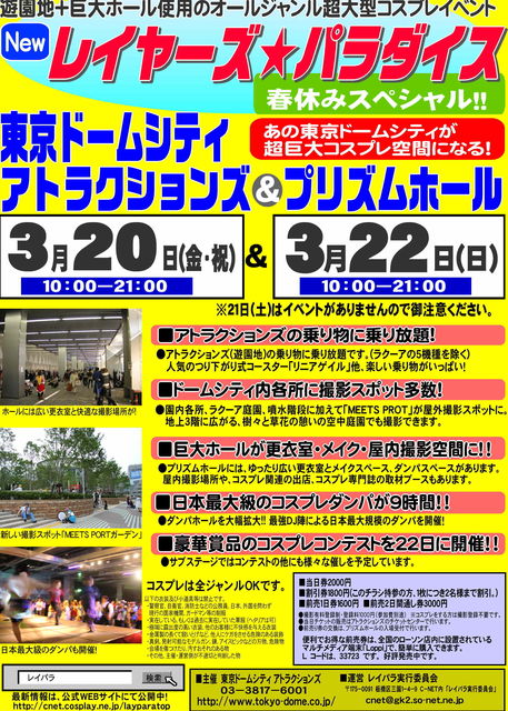 10:00〜21:00”あの東京ドームシティが超巨大コスプレ空間になる” ◎試合後初めてのイベントでナマ乙に会いに来て下さい (是非コスでwwww) 最新情報・詳細はコチラ http://cnet.cosplay.ne.jp/layparatop.htm