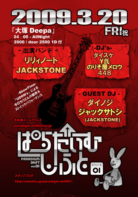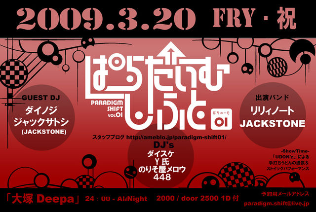 予約受付開始 チケットの予約受付を開始します。 ご希望の方は当トピックスに枚数記載の上書き込みをお願いします。 未だイベントの全貌が明らかになっていないままに 予約を受け付けてしまいます。 「ライブ+DJ+パフォーマンス」 ライブに酔いしれたい方、音楽の波に溺れ踊りたい方、 面白嗅覚が反応してしまった方、裏切りません。 みんなで笑顔で楽しみましょう。大丈夫。絶対大丈夫。 ************* 《チケット予約の流れ》 ・当チケット予約受付トピックに「お名前(mixiネーム可)・希