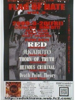 RED主催のガチメタルイベント!! FLAG OF HATE Vol.2 @Cyber-box[Naha] 2009/3/20 前売\1000 OPEN /19:00 Start/19:30 出演: RED [Thrash Metal] 鉄カブト [Heavy Metal] THORN OF TRUTH [Thrash/Hard core] HEINOUS CRIMINAL [Death/Thrash] Death Point Theory [Metal/Hard Core] DPTは今年初那覇進出!! Cyber Boxに関しては初陣です!! この日もデモ音源持って行きます!!よろしくDEAAAAAAATH!! あ、6月にSalt & Pepperで殺ります!!詳細は恐らく来月以降だと思われます!!