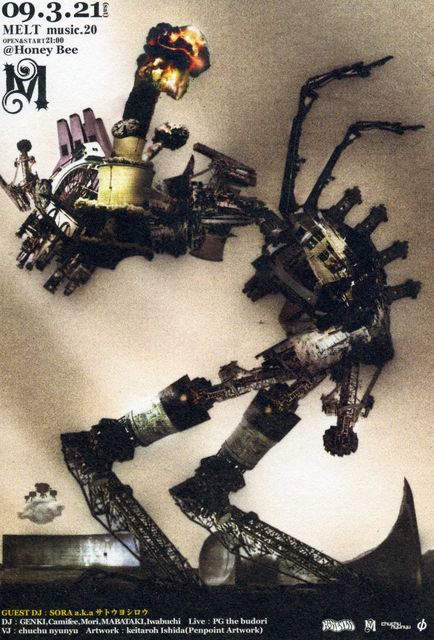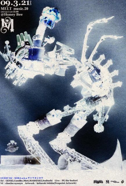 *MELT music. 20* 2009/03/21 Sat. @Honey Bee door:1000yen(Without Drink) OPEN:21:00 ●Guest DJ SORA a.k.a サトウヨシロウ (from 青い鳥のレストラン) DJs GENKI CAMIFEE MABATAKI MORI IWABUCHI VJ AYAE LIVE PG THE BUDORI ●Melt 『ジャンル』 『カテゴリー』 『思想』 『観念』 『価値観』 日常生活に蔓延る区切りという区切りを融解する空間を目指し 秋田は山王HoneyBeeにて狼煙を上げる。BreakBeats, HipHop, Dub, Electronica, Techno, Drum N Bass, Ambient, House, Roots Music...etc.と異な