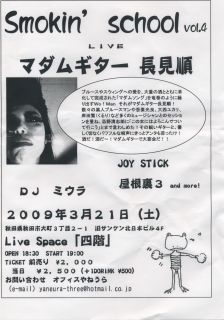 長見さんが秋田にやってきます!! 秋田のみならず近県の方々も是非ともお越し下さい!! 3月21日(土) LIVE & DJ@LIVE SPACE 「四階」 (http://lifestyle-co.com/yonkai/) ''SMOKIN' SCHOOL vol.4'' OPEN 18:30 START 19:00 TICKET 2,000円 / 2,500円(1DRINK 500円別) (LIVE) ☆長見 順(マダムギター) ☆ダースコちんどん隊ミニ(おさむ+カチューシャ安田) ☆JOY STICK ☆ボンデンズ ☆屋根裏3 (DJ) ☆ミウラ ☆秋田スリム 前売希望のかたはメッセージにて受付しております。 宜しくお願いします!