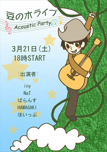 ○3月21日(土) 徳島駅前カフェ豆の木にて 豆の木ライブ 「Acoustic Party」 17時30分 オープン 18時 スタート ノーチャージ 1オーダーのみ 出演 iny、Nat、ばらんす、HAMAGAKI、ほいっぷ みんな遊びに来てくださいな☆