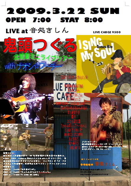 レフュッジ伊勢崎のイベントに出演します 日時:2009.3.22(日) Open15:00 Start15:30 会場:REFUGE 伊勢崎 (群馬県伊勢崎市東本町103-4 DUSTBOWL伊勢崎 TEL 0270-21-1321) http://www.dustbowl.co.jp/refuge/index.htm 料金:¥800