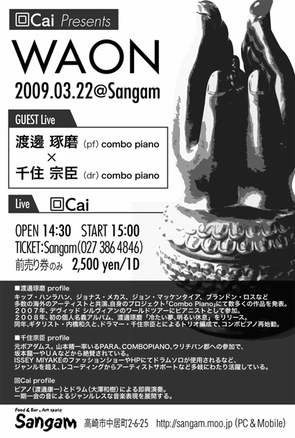 ■3/22(日) 回Cai Presents「WAON」@Sangam OPEN14:30 START15:00 TICKET:2,500円(前売り券のみ) GUEST Live:渡邊琢磨×千住宗臣(a.k.a COMBO PIANO) Live :回Cai チケット予約は電話にて受け付けます。 http://sangam.moo.jp/top.htm