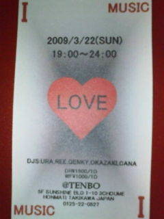 どうも管理人 DJ KAZOO でございます寒い冬いかがお過ごしでしょうか? TENBO のオーナーとSTAFFの自分は寒がりなので冬はツラいです(笑) さてさて3月の"I LOVE MUSIC"のお知らせでございます I LOVE MUSIC 2009/3/22(SUN) 19:00〜24:00 DJS URA CANA REE OKAZAKI GENKY DR 1000/1D WF 1500/1D TENBO (テンボ) 滝川市本町3丁目1ー10 サンシャインビル 5階 詳しい情報はお気軽にこちらまでお問い合わせください 0125ー22ー0527