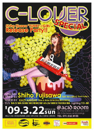 2009.3.22(sun)@ACIDROOM [C-LOVER]SPECIAL Shiho Fujisawa"FUNKY GIRL"Release Party!! ■Ticket 前売り¥1500 当日¥2500 ACIDMEMBER¥2000 [All 1Drink Order] ■SpecialGuestDJ Shiho Fujisawa[EATRECORDS] ■GuestDJ KAZYANIGHT[Kiss&Ride/HPNOTIQRECORDS] ■DJ RAO/MASUMI/MOWMOW/S@chi/MIKU/ISHIKAWA ■Lighting TO-MI ■Food出店 ボトムカフェ チケット取扱いしています〜!!! 出演DJまたはボトムカフェにお問い合わせください!! メッセージでもOKです!! 前売りご購入の