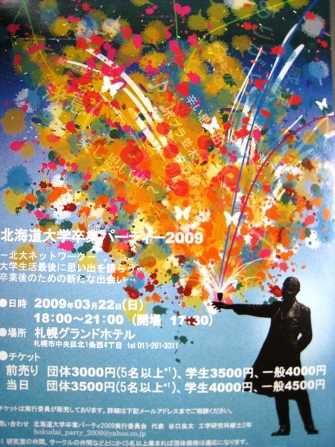 管理人様失礼致します。 不適切であれば削除してください。 *******北大卒業パーティー2009のご案内******* こんにちは!突然ですが、【北大卒業パーティー】というものの存在をご存知でしょうか? 私達卒業パーティー実行委員は、『北大ネットワーク』を合言葉に、今後日本全国、もしくは全世界へ飛び立っていく北海道大学の卒業生同士が、本パーティーで知り合い、より一層絆を深められるようなパーティーを開催しようという考えのもとで、活動を行っております。 これまで卒業式というのは、体育館で名前を呼ばれるだけの正直、味気な