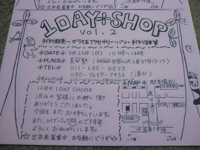 今週末も、sayap出店します! 3月22日(日曜日) 時間:10時〜14時 場所:美安塾 手稲区西宮の沢条3丁目13-15 (発寒ジャスコの通りを、手稲方面へま〜すぐ15分くらい歩いたところです) 地図→http://www.mapfan.com/m.cgi?MAP=E141.16.5.6N43.6.8.8&ZM=12 ☆美安塾☆ 心と身体に癒しのお手伝い、そして美容と健康の コラボレーション美と安らぎの自宅サロン。 木枠に囲まれた玄関が目印です! http://g-h-a.net/shop/inazumikouen.html 電話:011-685-8823 先生:清水 玲子さん sayapwoをはじ