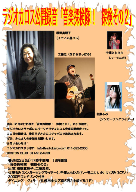●3月22日(日)17時半開場 18時開演 「音楽探検隊 探検その2」 出演:稲野真理子、工藤忠幸、佐藤るみ(シンガーソングライター)、千葉ともひさ(ハーモニカ)、小川いづみ(ピアノ) 3000円ワンドリンク付き ダイニング ヴィラ (札幌市中央区南5西2中銀ビル1F) 前回、12月に行った「音楽探検隊」のパート2です。 BOSTON CLUBとある中銀ビルの1階ですので、終わった後はBOSTON CLUBで2000円で打ち上げを行います。 ぜひ、みなさんの参加をお願いします。