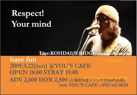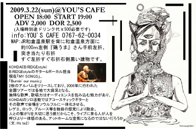 Have Fun!! YOU'S CAFE LIVE!! 2009,3,22(sun) @和倉YOU'CAFE KOHDAI[from B:RIDGEstyle]アコースティックLIVE OPEN 18:00 START 19:00 前売り¥2000 当日¥2500(別途ドリンク¥500) 前回のライブも大好評!たくさんの方に来ていただきありがとうございました。 回を重ねるごとにパワーアップしお客さんがお客さんを呼んでくれて すばらしいパーティーになってきました。 今回もさらに楽しいパーティーになること違いないでしょう! チケットなどのお問い合わせは直接店頭でも、自分に予約でもOKです。