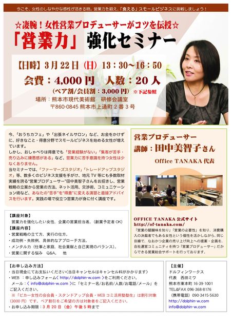☆凄腕!女性営業プロデューサーがコツを伝授☆ トレードアップ・スタジオ 営業力講師 田中代表が熊本市で ドルフィンワークス主宰のセミナーを開かれます。 ドルフィンワークスさんから素敵なチラシを作っていただいています。 トレードアップ・スタジオ受講生は 人には言えない特別価格で参加できるそうですよ! 【日時】3月22日(日)13:30〜16:50 会費:4,000円 人数:20人 (ペア割/会員割:3,000円) 場所:熊本市現代美術館 研修会議室 〒860-0845熊本市上通町2番3号 お時間のあ