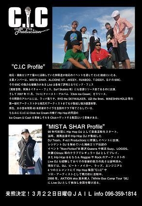 今週22日の日曜日 EVERY 4th SUNDAY PROJECT 「adapt」は レペゼン湘南のHIP-HOPグループ C.I.Cより"MISTA SHAR"をゲストに迎えての SPECIAL NIGHT!!!!!! 3月22日日曜@JAIL "adapt special" 22:00start Door:1500yen(w1d) Special guest MISTA SHAR from C.I.C -DJ'S- HYT NAKAO KENTARO SHOGO 日曜夜の音楽好き、HIP-HOP好き、 酒好きはJAILに集合です!! 日曜の夜にGOOD MUSICを体感しながら飲み会しましょう! 楽しみだーーー!! C.I.Cコミュ http://mixi.jp/view_community.pl?i
