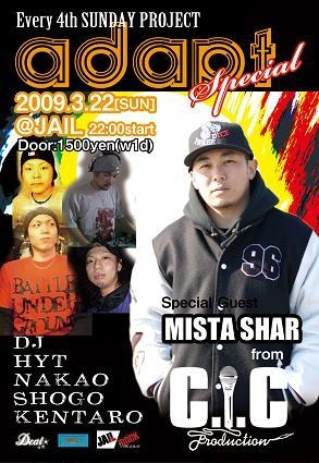 Every 4th Sunday Project 「adapt」@JAIL 2009/3/22(SUN) START 22:00〜 PRICE 1500yen/w1d ☆SpecialGuest☆ MISTA SHAR(ミスタ・シャー)詳しくは↓を -Regular DJ'S- HYT NAKAO KENTARO -Suport- SHOGO 急遽開催決定!!!!!!! 今度の日曜日! 是非足運んでくださいね! MISTA SHAR(ミスタ・シャー) 90年代初頭にHip Hop DJとして音楽活動をスタート。当時、湘南出身のHip Hop DJが集結したDJ Team、F-ect Productionzに所属しイベントに出演。レジデントDJを努めてい