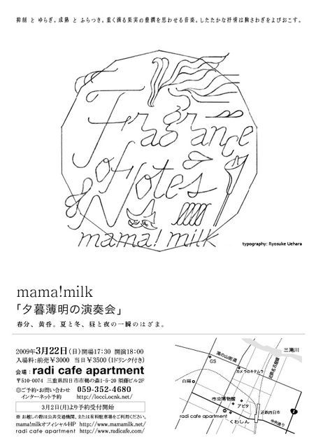 1月24日にロンドンのCargoで開催された「Worldwide Awards 2009」にて、最新アルバム「Fragrance of Notes」が、「Jazz Album of the Year 2009」のベスト5に選ばれたmama!milk。今回はradi cafeで夕暮薄明の演奏会です。